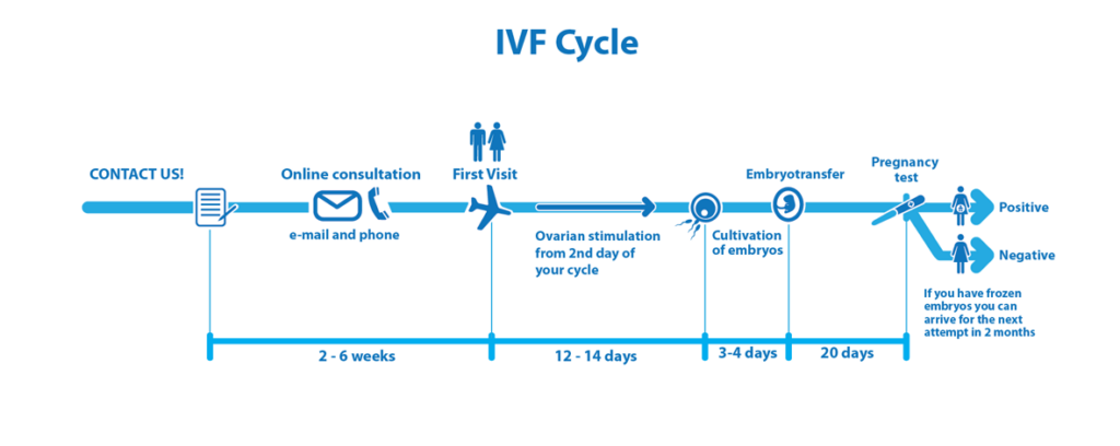 Your total stay in Prague is approximately 7-10 days if you undergo an ultrasound scan on the 6th day of your cycle back home and send us results via email. You will arrive on the 9th day of your cycle to undergo ultrasound scan at the clinic and to complete pre-treatment tests for general anaesthesia (egg retrieval is done under general anaesthesia). The egg retrieval takes place around 12th day of your stimulation period and embryo transfer will be after 3-5 days.